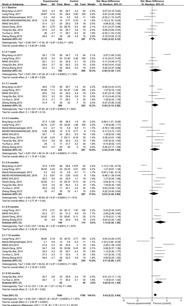 我們分析了ALB和INR水平,以研究干細(xì)胞療法對肝臟合成功能的影響。與對照組相比,干細(xì)胞治療后ALB 水平顯著升高 (p<0.0001)。但應(yīng)考慮ALB水平的異質(zhì)性(p<0.00001;I2=87%)。亞組分析顯示,干細(xì)胞治療后9、12、24個月ALB水平顯著升高(圖2)。