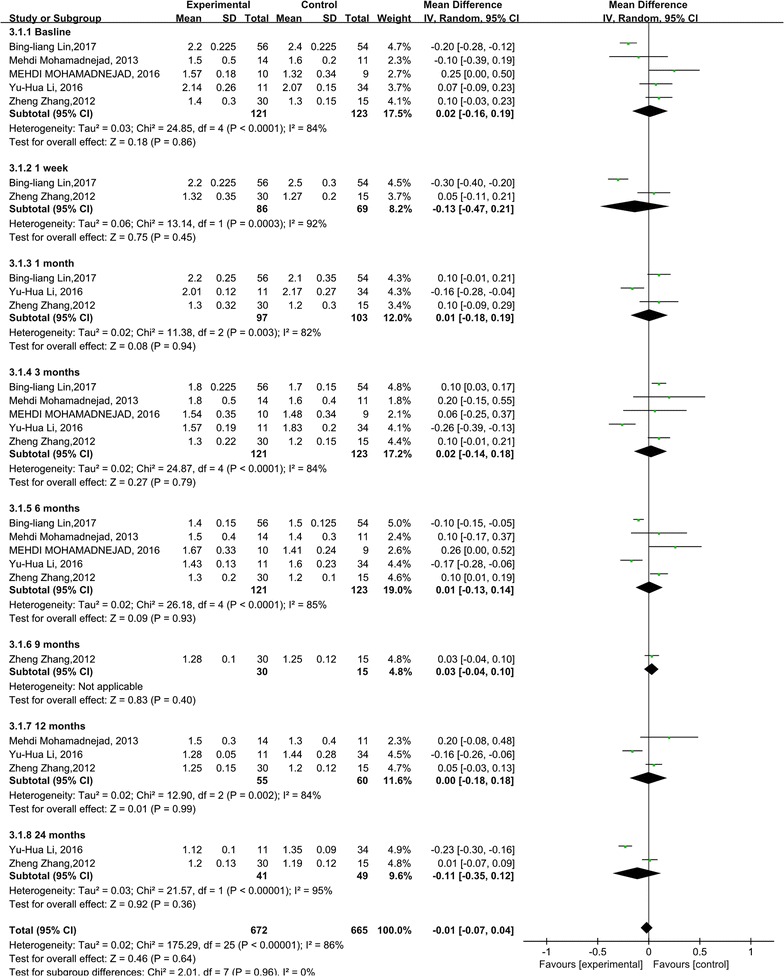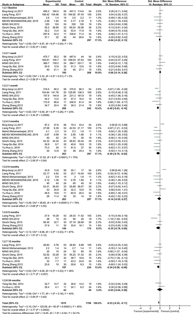 與對照組相比,干細(xì)胞治療后ALT水平顯著降低(p<0.00001)(圖5)。亞組分析顯示,干細(xì)胞治療組ALT水平也有所降低,在1周、1個月和6個月時間點(diǎn)均低于基線和相應(yīng)對照組。干細(xì)胞治療后9、12和24個月時ALT水平無顯著差異。關(guān)于1周、6和9個月時的ALT水平,未發(fā)現(xiàn)異質(zhì)性。但是,應(yīng)考慮1、3和12個月時 ALT水平的異質(zhì)性。但這只能通過一兩項研究來解釋。