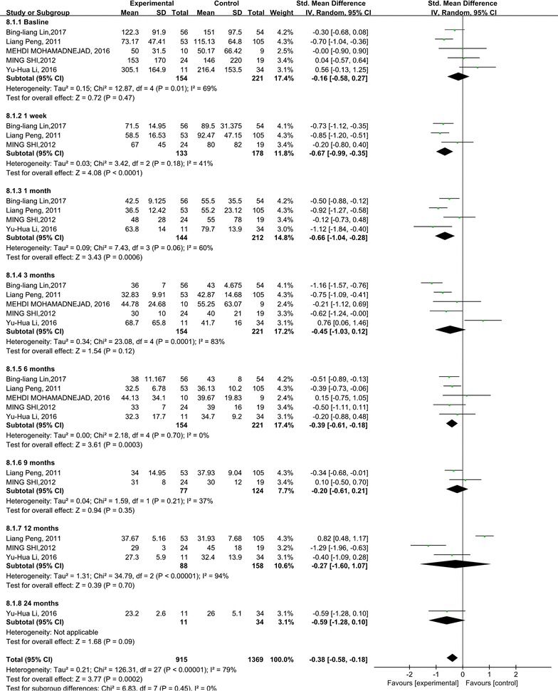 在這項研究中,還通過分析 TBIL 和 ALT 水平來評估干細(xì)胞療法對減輕肝損傷的作用。干細(xì)胞治療后1、3、12個月,TBIL 水平顯著下降(p=0.0008;p=0.04;p=0.007)。與對照組相比,在1周、6、9和24個月時間點(diǎn)均無顯著性差異(圖4)。除3、6 和9個月外,未檢測到關(guān)于TBIL水平的異質(zhì)性。但這只能通過一兩項研究來解釋。