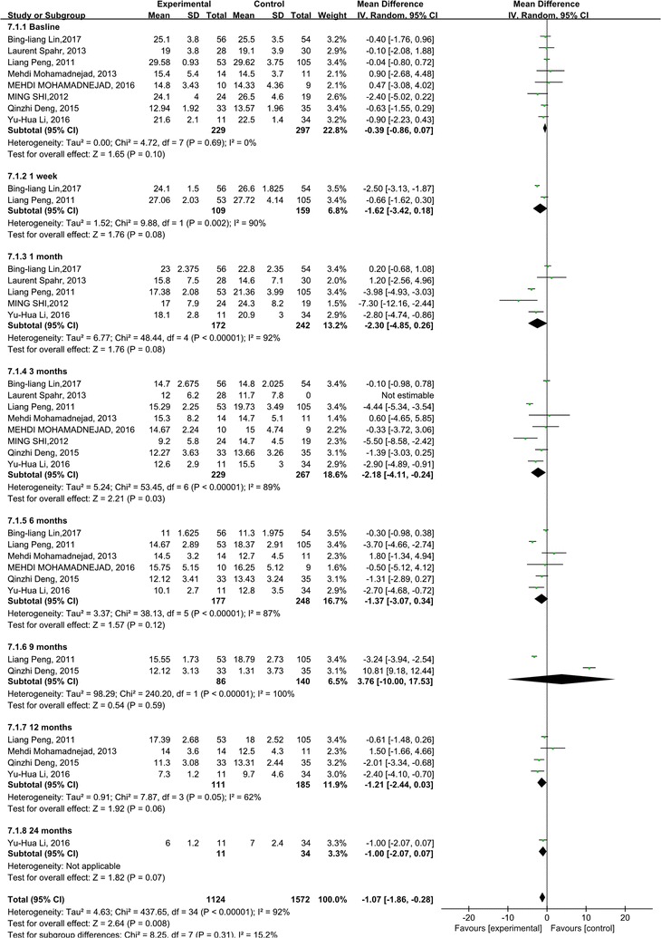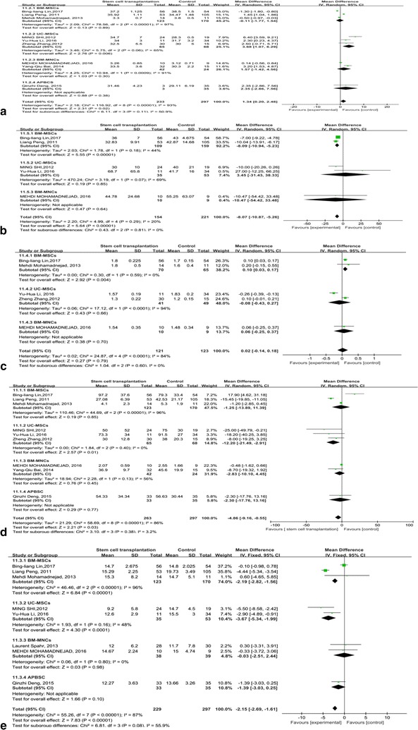 MELD評分主要用于評估終末期肝病的預(yù)后。我們觀察到干細(xì)胞治療組和對照組的MELD評分均有所下降。干細(xì)胞治療組和對照組之間存在顯著差異 (p =0.008)(圖6)。此外,盡管進(jìn)行了亞組分析,但這些研究的異質(zhì)性很高 (I 2 : 62–100%)。但這也可以僅通過一兩項研究來解釋。