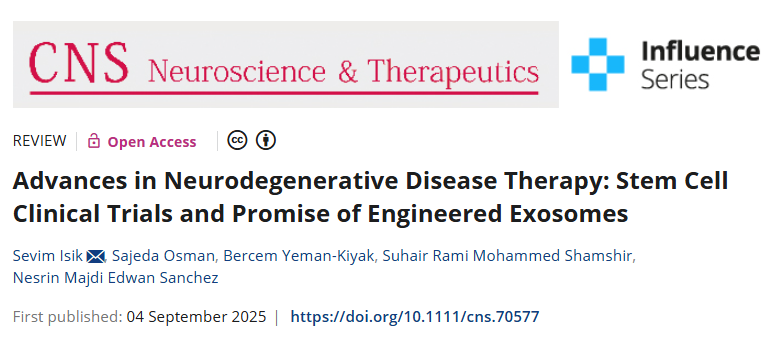 [1]:Isik S, Osman S, Yeman-Kiyak B, Shamshir SRM, Sanchez NME. Advances in Neurodegenerative Disease Therapy: Stem Cell Clinical Trials and Promise of Engineered Exosomes. CNS Neurosci Ther. 2025 Sep;31(9):e70577. doi: 10.1111/cns.70577. PMID: 40904199; PMCID: PMC12409071.