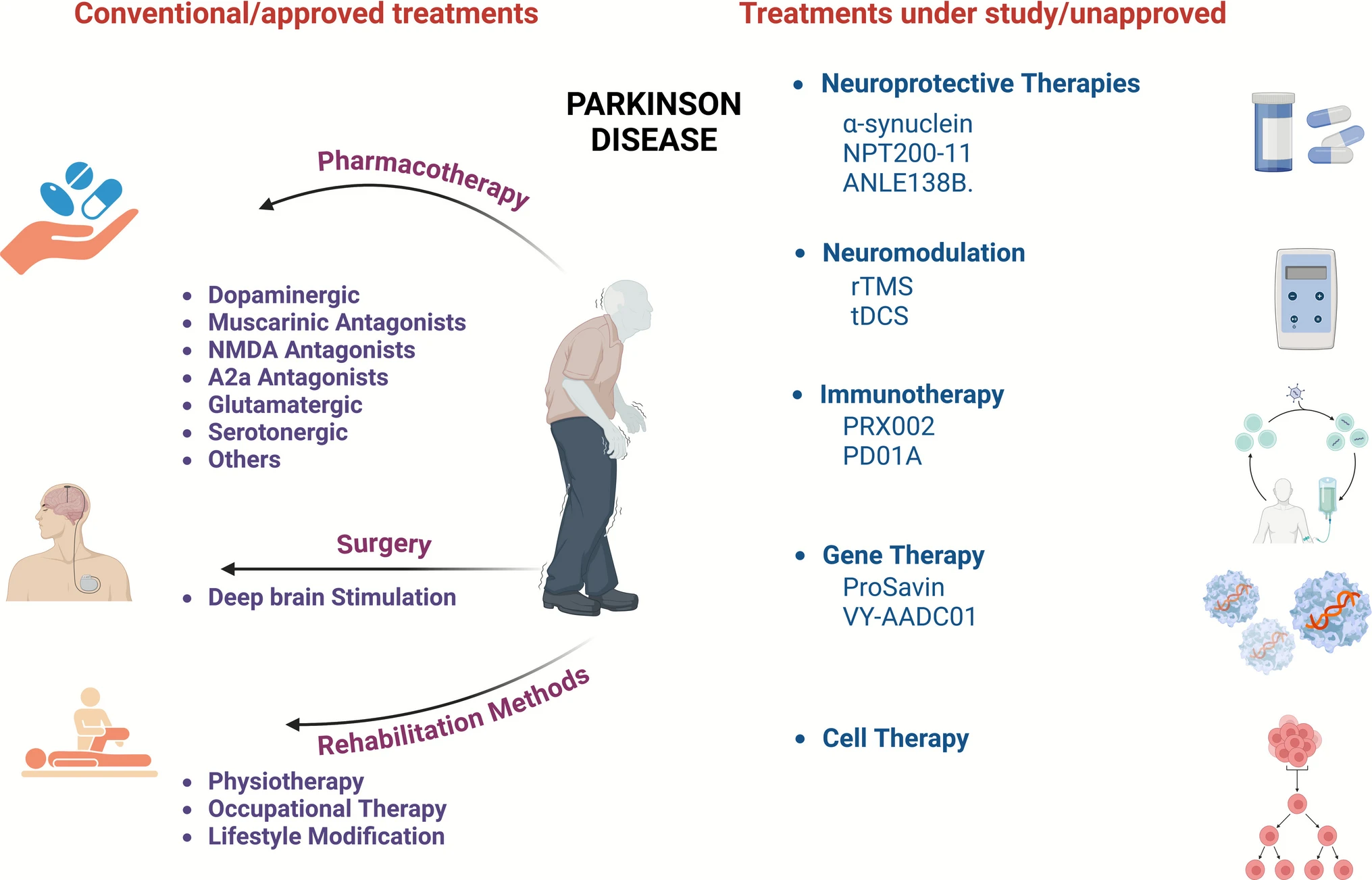 盡管現(xiàn)代醫(yī)學(xué)通過藥物(如左旋多巴)和手術(shù)(如深部腦刺激)手段能夠有效控制部分運(yùn)動癥狀,但所有現(xiàn)有療法均屬于對癥治療,無法從根本上延緩或阻止黑質(zhì)多巴胺能神經(jīng)元的退化進(jìn)程,這構(gòu)成了當(dāng)前臨床治療的主要局限(圖1)。