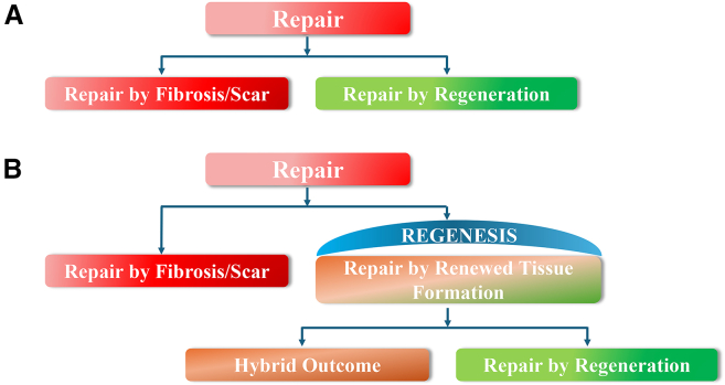 (B) 將再生納入經(jīng)典修復(fù)范式的精細(xì)框架。再生是指損傷后組織重新形成,涵蓋一系列結(jié)果,包括以部分組織更新伴纖維化為特征的混合愈合反應(yīng),以及以完全結(jié)構(gòu)和功能恢復(fù)且不伴纖維化為特征的完全再生。大多數(shù)基于干細(xì)胞的療法產(chǎn)生的是再生,而非純粹的纖維化或完全再生