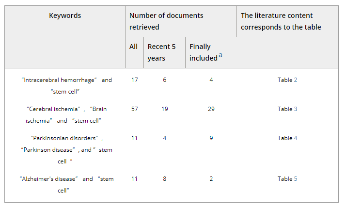 干細胞治療腦出血(ICH):ICH中與干細胞治療相關的有效文章有4篇。從手稿中提取了臨床試驗的階段、細胞干預、劑量、輸注部位、試驗數量(對照數量)、主要結果、安全性和年份(表2 )。