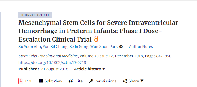 So Yoon Ahn用低劑量腦室內移植MSCs治療了三名患有嚴重腦室內出血 (IVH) 的早產兒和用高劑量MSCs治療了六名嬰兒。結果表明,移植耐受性良好,移植后腦脊液(IL)-6水平升高。初始CSF IL-6和腫瘤壞死因子-α水平與基線心室指數顯著相關。在這項研究中,沒有嬰兒死亡或出現(xiàn)與干細胞移植相關的嚴重不良反應。嚴重腦室內出血的早產兒腦室內移植間充質干細胞可能是安全可行的,值得進一步的II期研究。