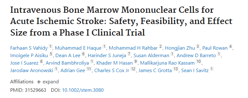 在一項單臂I期臨床試驗中,在發(fā)病后24-72小時內對中度急性缺血性卒中患者進行骨髓采集和靜脈輸注自體BMMNCs(1000萬個細胞/千克),接受治療的患者表現(xiàn)出1個百分點的降低第90天在mRS中的 ES,結果安全。