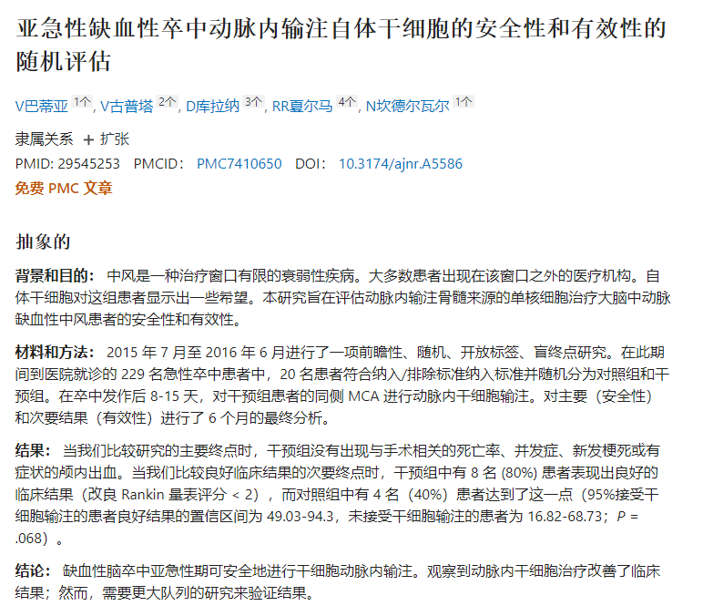 VBhati對干預組中風發(fā)作后8-15天的10名急性中風患者進行同側MCA動脈干細胞輸注,而對照組不進行輸注。結果發(fā)現(xiàn),干預組中有 8名患者表現(xiàn)出良好的臨床結果,改良Rankin量表評分小于2,而對照組中有4名患者達到了這一結果。