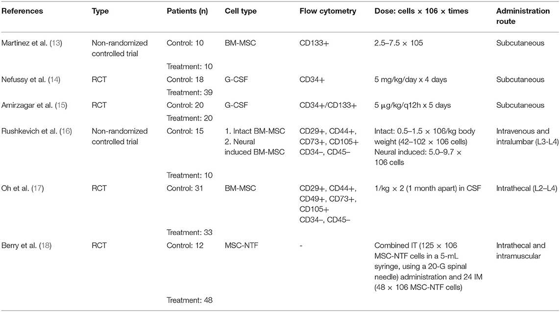 我們選擇了對照臨床試驗,包括隨機(jī)對照試驗(RCTs)、半隨機(jī)試驗和非隨機(jī)臨床試驗(表1)。研究中包括的ALS患者使用El Escorial標(biāo)準(zhǔn)進(jìn)行診斷,沒有年齡限制。無論使用何種SC類型,研究均被納入。我們從這項研究中排除了動物研究和不受控制的臨床試驗。