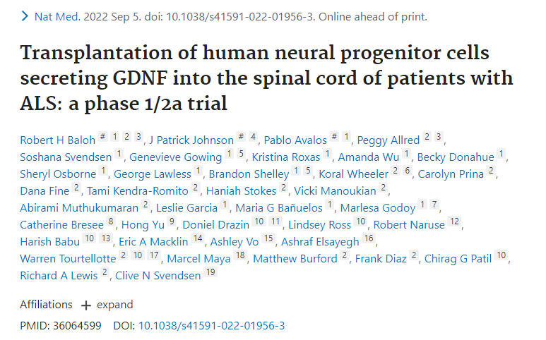 在1/2a期臨床研究(NCT02943850)中,CNS10-NPC-GDNF被移植到18名ALS參與者的腰椎中。主要安全性終點(diǎn)在1年時達(dá)到,與未治療腿相比,治療腿的移植對運(yùn)動功能沒有負(fù)面影響。對死于疾病進(jìn)展的13名參與者的組織分析顯示移植物存活和GDNF產(chǎn)生。