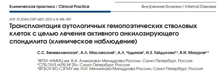 俄羅斯期刊《KAиниЧeckaanpakrka /Clinical Practice》近期發(fā)表了一項名為《自體造血干細胞移植治療活動性強直性脊柱炎(臨床觀察)》的研究成果。重點介紹了干細胞移植治療重度強直性脊柱炎患者的7年臨床觀察的結(jié)果。[8]