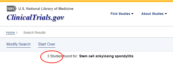 截止2022年11,在美國(guó)國(guó)立衛(wèi)生研究院的最大臨床試驗(yàn)注冊(cè)庫(kù)clinicaltrials.gov網(wǎng)站上注冊(cè)的有關(guān)干細(xì)胞治療強(qiáng)直性脊柱炎的臨床研究項(xiàng)目有3項(xiàng)。