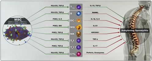 盡管使用NSAIDs、糖皮質(zhì)激素、DMARDs和生物藥物治療強(qiáng)直性脊柱炎取得了相當(dāng)大的成就,但尚未建立高效無(wú)副作用的治療方式。具有大量免疫調(diào)節(jié)和再生特性的間充質(zhì)干細(xì)胞是治療免疫介導(dǎo)疾病(如 AS)的有利治療選擇。間充質(zhì)干細(xì)胞可以調(diào)節(jié)與強(qiáng)直性脊柱炎發(fā)病機(jī)制相關(guān)的免疫細(xì)胞的激活,并可以促進(jìn)后續(xù)組織損傷的再生過(guò)程。