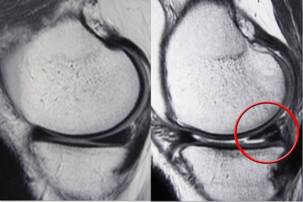 MRI 掃描顯示(左)正常的半月板和(右)撕裂的半月板。撕裂可以看作是穿過(guò)半月板黑色主體的白線