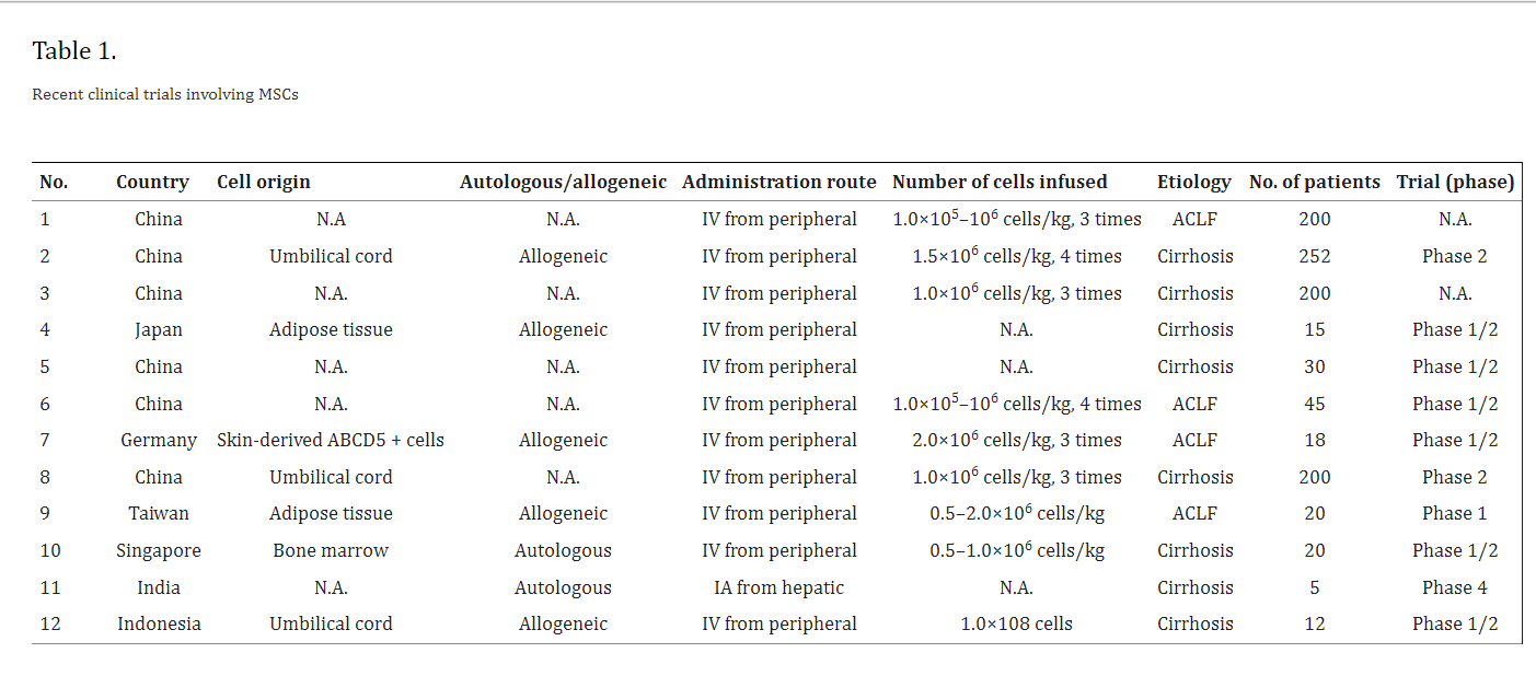 此外,為了描述以MSC為導(dǎo)向的臨床試驗(yàn)的最新趨勢(shì),我們根據(jù)ClinicalTrials.gov(表格1). 其中大部分在亞洲國(guó)家注冊(cè)。研究在細(xì)胞來(lái)源、自體與同種異體性質(zhì)以及肝硬化的病因?qū)W方面各不相同。然而,在大多數(shù)研究(12項(xiàng)中的11項(xiàng))中,MSC給藥是通過(guò)外周注射每劑約1×106MSC/kg。研究不僅關(guān)注肝硬化,還關(guān)注急性慢性肝衰竭 (ACLF)。由于MSCs在炎癥期間表現(xiàn)出更強(qiáng)的治療效果,因此它們?cè)贏CLF的情況下可能特別有效??偠灾S多面向MSC的臨床試驗(yàn)尚未超過(guò)I期或II期。