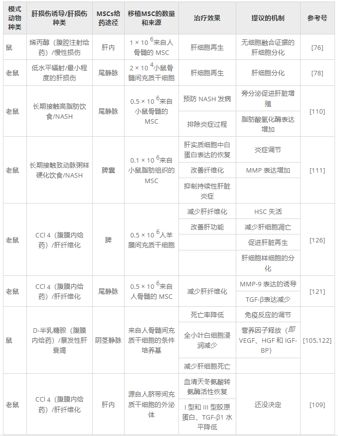 表2:使用間充質(zhì)干細胞或其衍生物治療肝損傷的臨床前研究。