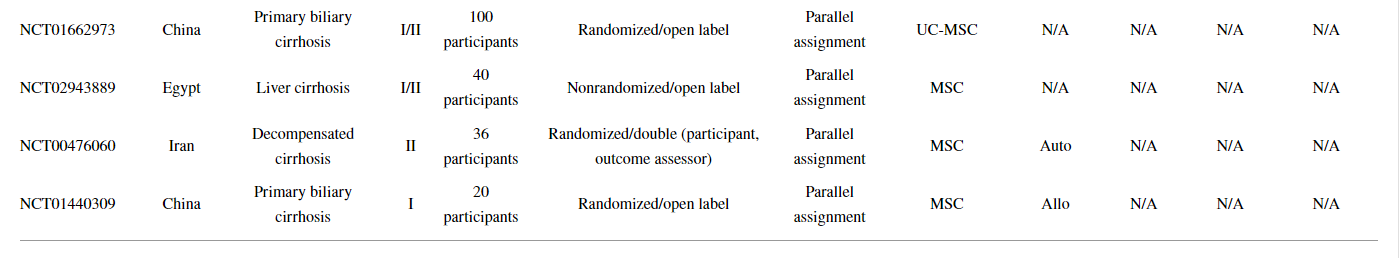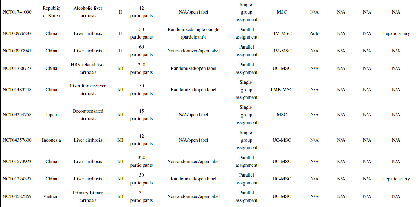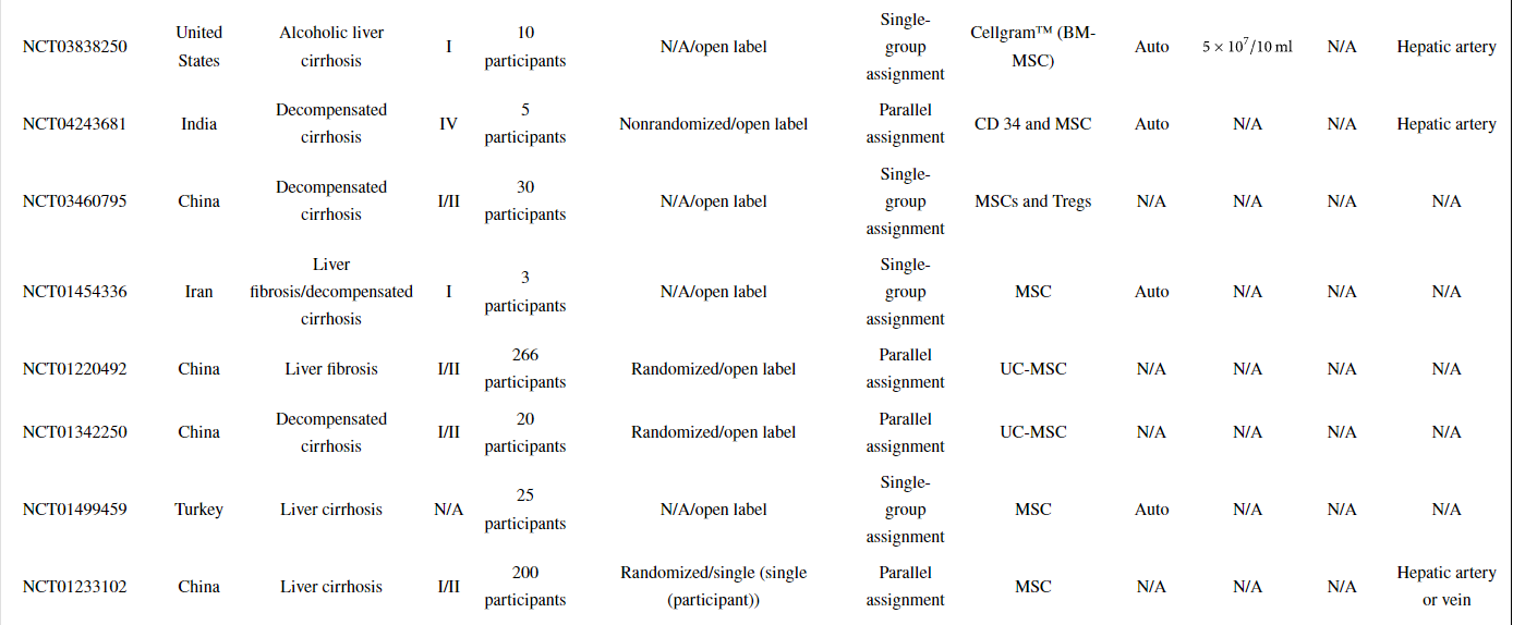 以上顯示了31項(xiàng)已完成或正在進(jìn)行的MSC治療或MSC聯(lián)合細(xì)胞治療肝硬化(LC)的臨床試驗(yàn)。同時(shí),已經(jīng)發(fā)表了許多描述使用MSCs進(jìn)行臨床試驗(yàn)結(jié)果的報(bào)告。