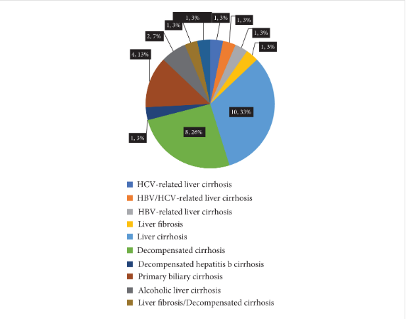 31例肝硬化的病因略有不同。肝硬化10例(32.3%),失代償期肝硬化8例(25.8%)。第三肝硬化為原發(fā)性膽汁性肝硬化,4例(12.9%)。酒精性肝硬化2例(6.5%),HCV相關(guān)性肝硬化、HBV相關(guān)性肝硬化、肝纖維化、失代償性乙型肝炎肝硬化各1例(3.2%)。肝纖維化和失代償期肝硬化1例(3.2%),肝纖維化和肝硬化1例。肝硬化的病因體現(xiàn)了不同疾病的發(fā)病率,可能為相應(yīng)的干預(yù)提供潛在的方法(圖3(b)))。
