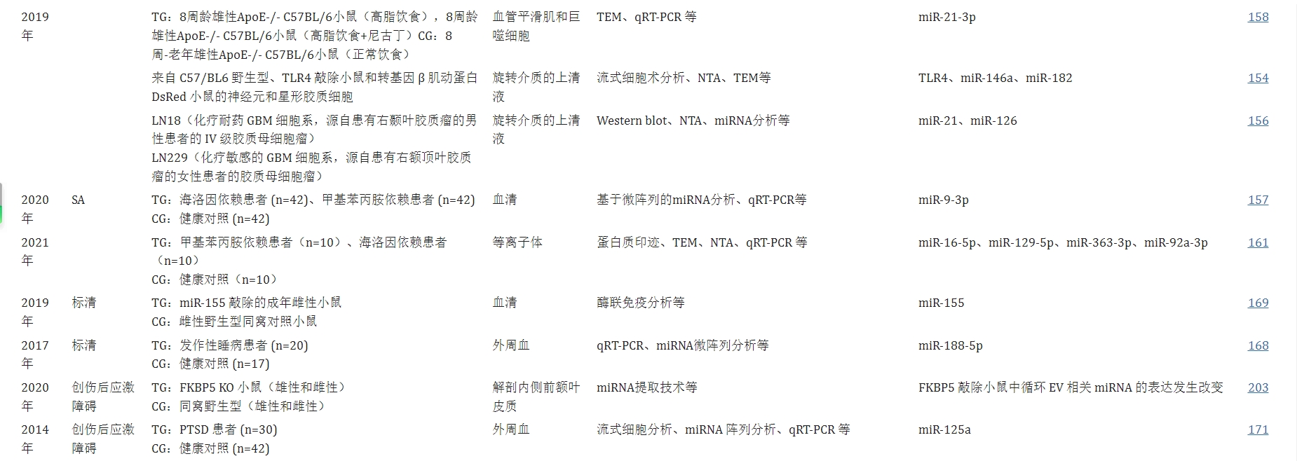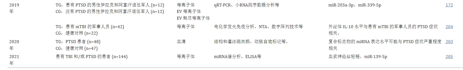 研究表明這些疾病可能具有相似的病理生理機(jī)制。盡管越來越多的新興研究關(guān)注EV相關(guān)miRNA和PTSD的其他生物標(biāo)志物,但大多數(shù)研究結(jié)果仍需要進(jìn)一步的臨床驗證。