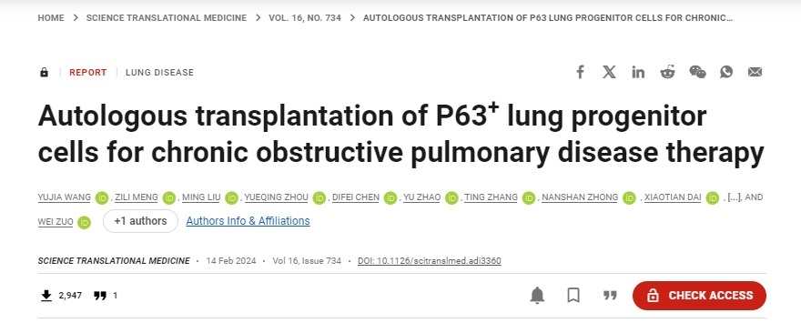[9]Yujia Wang et al.,Autologous transplantation of P63+ lung progenitor cells for chronic obstructive pulmonary disease therapy.Sci. Transl. Med.16,eadi3360(2024).DOI:10.1126/scitranslmed.adi3360