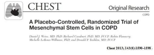 2013年,《Chest》雜志上發(fā)表了間充質(zhì)干細(xì)胞治療中、重度慢阻肺的安全性和有效性的臨床研究報(bào)告。在此項(xiàng)研究中共收治了62名慢阻肺患者,并隨機(jī)分為試驗(yàn)組和對(duì)照組,試驗(yàn)組患者通過靜脈輸注的方式進(jìn)行間充質(zhì)干細(xì)胞治療,每月1次,共4次。
