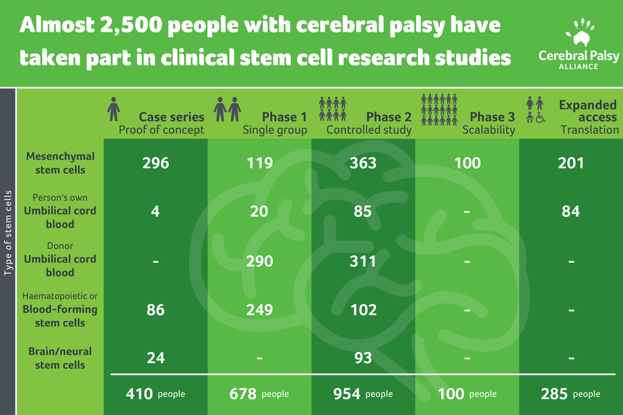 - 已有77項研究已完成或正在進行中,治療了2,427名腦癱患者。這一總數(shù)不包括通過私人診所尋求治療的人數(shù)以及未在ClinicalTrials.gov上注冊的未發(fā)表的臨床試驗的人數(shù)。