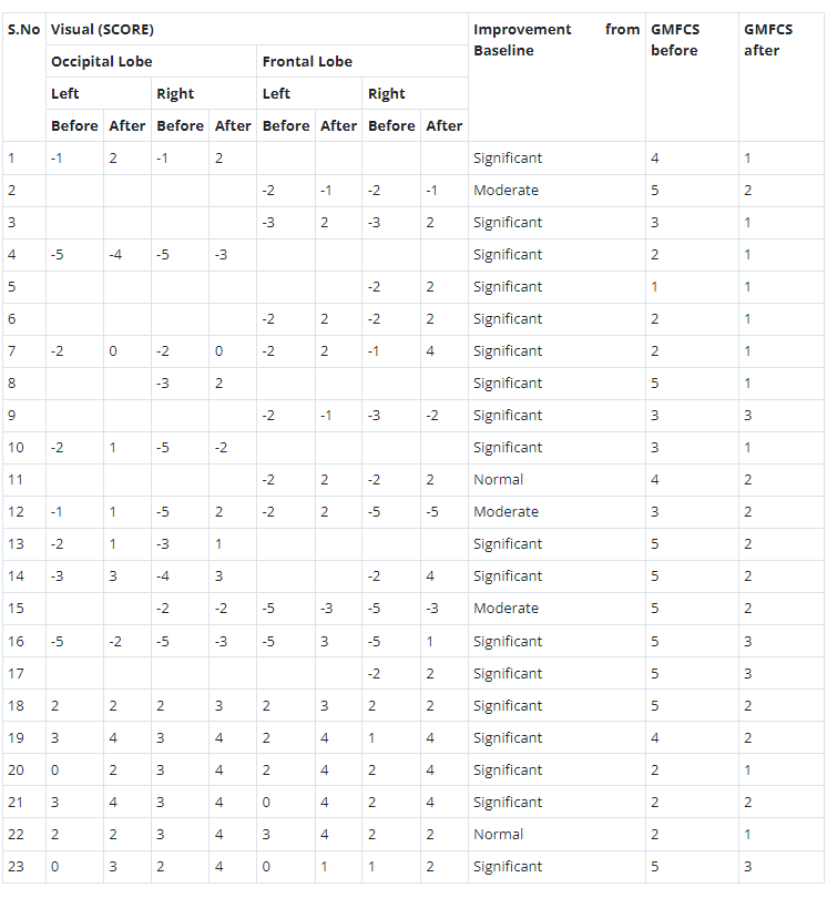 總體而言,治療結(jié)束時(shí),2名患者的灌注正常,18名患者(12名男性和6名女性患者)顯示灌注顯著改善(>60%),3名患者顯示灌注中度改善(30-60%)。大多數(shù)在接受hESC治療前額葉和枕葉嚴(yán)重低灌注的患者在接受 hESC 治療后情況有所改善。23名可獲得SPECT掃描報(bào)告的患者的GMFCS評(píng)分在hESC治療后有所改善(表2)。