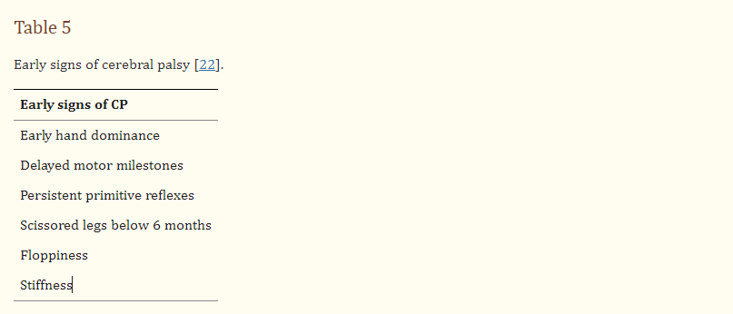 最近的一項(xiàng)研究表明,最常見的癥狀是在2歲之前使用單手,無法在適當(dāng)?shù)臅r(shí)間內(nèi)達(dá)到正常的里程碑,以及在一定時(shí)期后出現(xiàn)原始反射(表5) 。