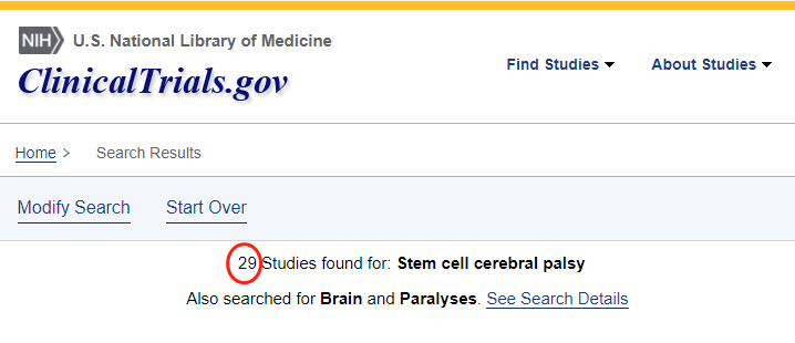 截止2022年12月,在美國國立衛(wèi)生研究院的最大臨床試驗(yàn)注冊庫clinicaltrials.gov網(wǎng)站上注冊的有關(guān)干細(xì)胞治療小兒腦癱的臨床研究項(xiàng)目有29項(xiàng),其中中國有三項(xiàng)。所涉及干細(xì)胞類型有神經(jīng)干細(xì)胞、骨髓干細(xì)胞、臍帶間充質(zhì)干細(xì)胞等,其中有些項(xiàng)目已經(jīng)完成,有些正在招募。