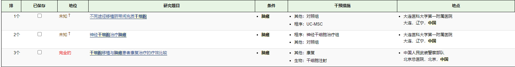 | 1個(gè) | | 未知 ? | 骨髓干細(xì)胞移植治療腦癱 | 腦癱 | 生物:干細(xì)胞療法 | |