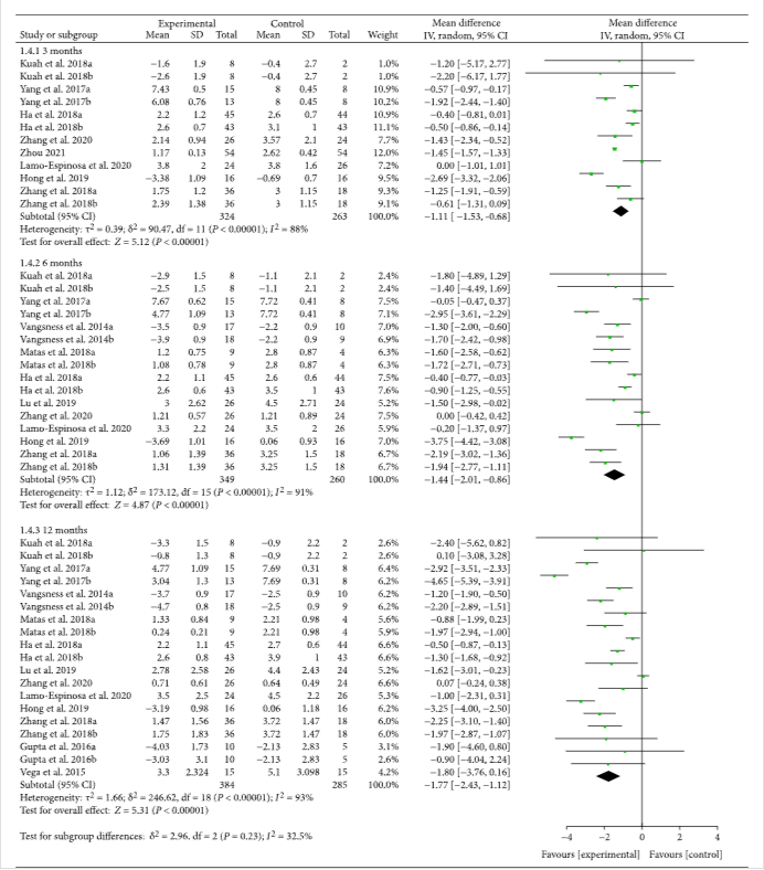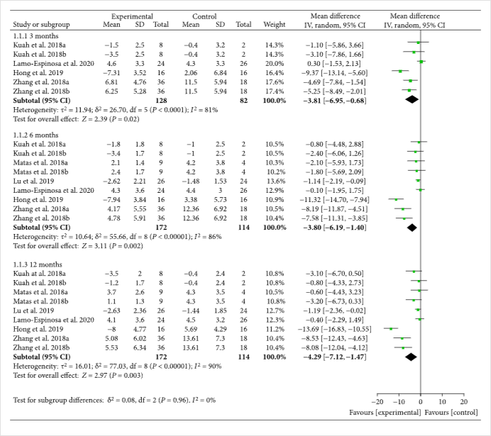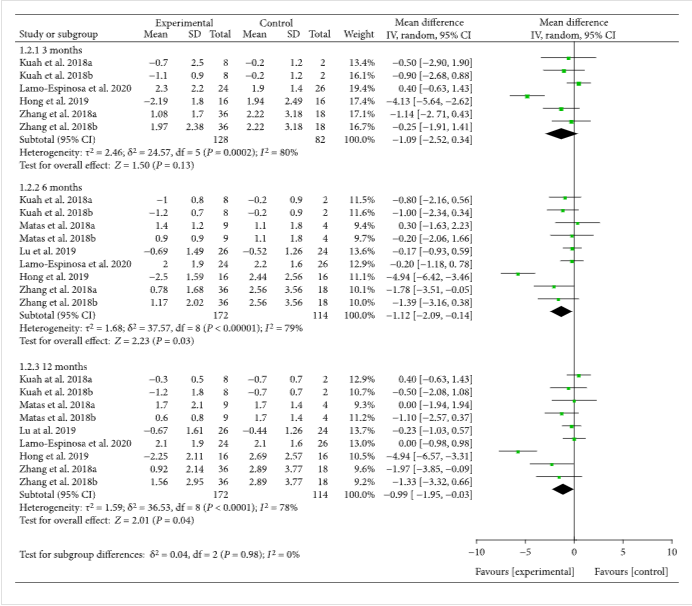 十三項臨床試驗報告了具有精確值的VAS。結(jié)果還顯示,MSC注射后第3個月隨訪VAS較對照組有所降低[-1.11(-1.53??,-0.68),],且效果至少持續(xù)12個月[-1.77(-2.43,-1.12),](圖2)。VAS的改善可能具有臨床意義。