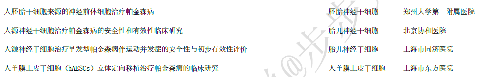 干細(xì)胞治療帕金森病目前也是一個不錯的選擇。國內(nèi)也有機(jī)構(gòu)正在積極開展治療帕金森的干細(xì)胞療法臨床研究。在兩委局,干細(xì)胞臨床研究備案項目目前有4個,細(xì)胞來源有3種(分別hESC衍生的神經(jīng)前體細(xì)胞,胎兒神經(jīng)干細(xì)胞和羊膜上皮干細(xì)胞),如下表: