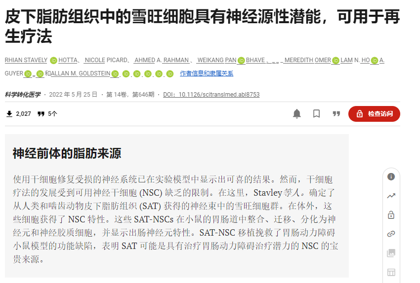 這些神經(jīng)干細(xì)胞是在科學(xué)家檢查小鼠皮下脂肪組織 (SAT)(也稱為體脂肪)時(shí)首次發(fā)現(xiàn)的,他們注意到一團(tuán)神經(jīng)纖維中似乎包含雪旺細(xì)胞,這是一種參與維持神經(jīng)系統(tǒng)的細(xì)胞周圍神經(jīng)系統(tǒng)的運(yùn)動(dòng)和感覺神經(jīng)元的再生。?根據(jù)5月25日發(fā)表在《科學(xué)轉(zhuǎn)化醫(yī)學(xué)》(Science Translational Medicine) 上的?一項(xiàng)研究,對(duì)這些雪旺細(xì)胞的進(jìn)一步體外分析表明,它們可以產(chǎn)生類似干細(xì)胞的特性。
