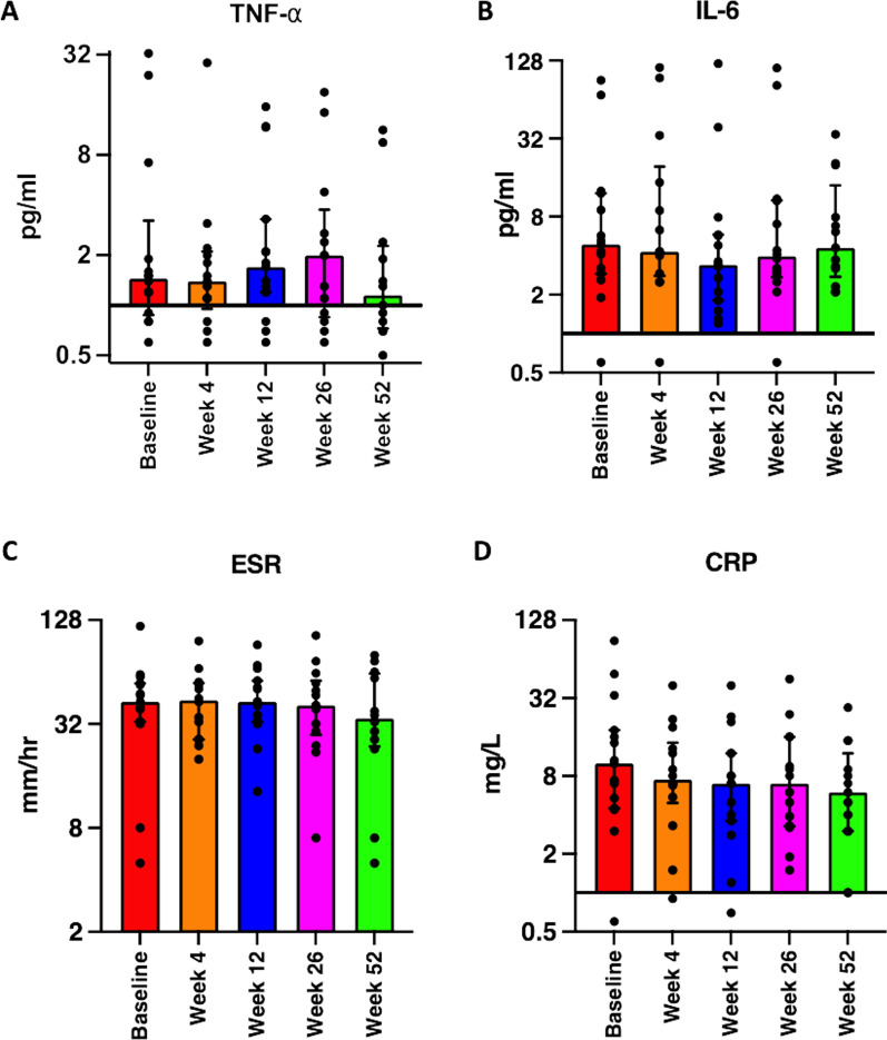 圖3:炎癥參數(shù)。與基線相比,后續(xù)訪問中炎癥細(xì)胞因子、TNF-α或IL-6的水平未顯示任何顯著變化 (a , b)。