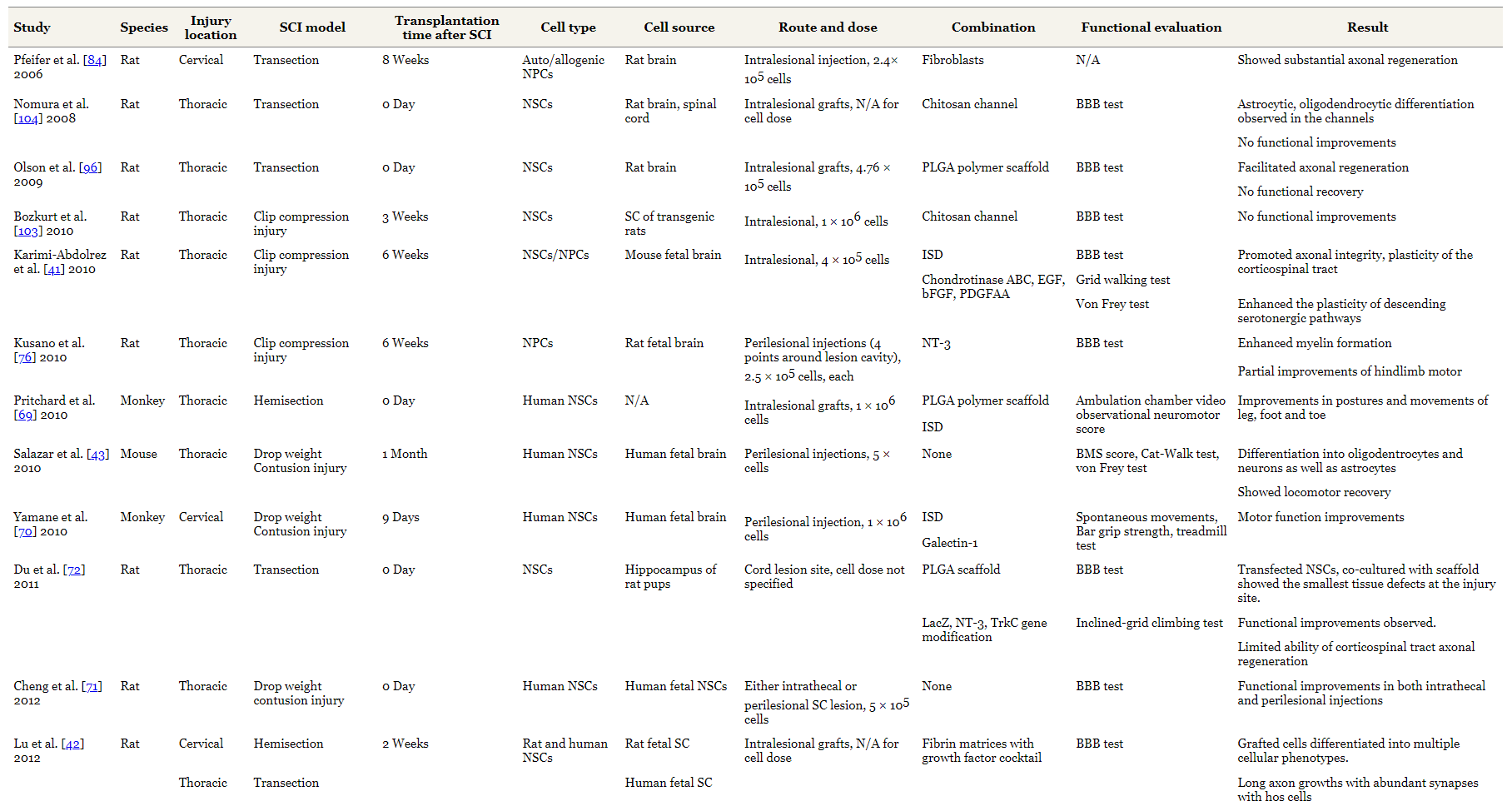 表1總結(jié)了使用NSC的實驗研究的特點。NSC治療已在SCI的各個階段進行了測試:急性、亞急性和慢性。小鼠和大鼠是最常用的動物。