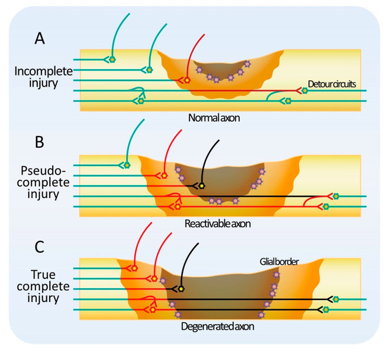 ( C ) 真正的完全傷害。無神經(jīng)組織(灰色)橫跨整個脊髓,在頭端或尾端對周圍可再激活組織的治療無法提供功能性顱骨連接。