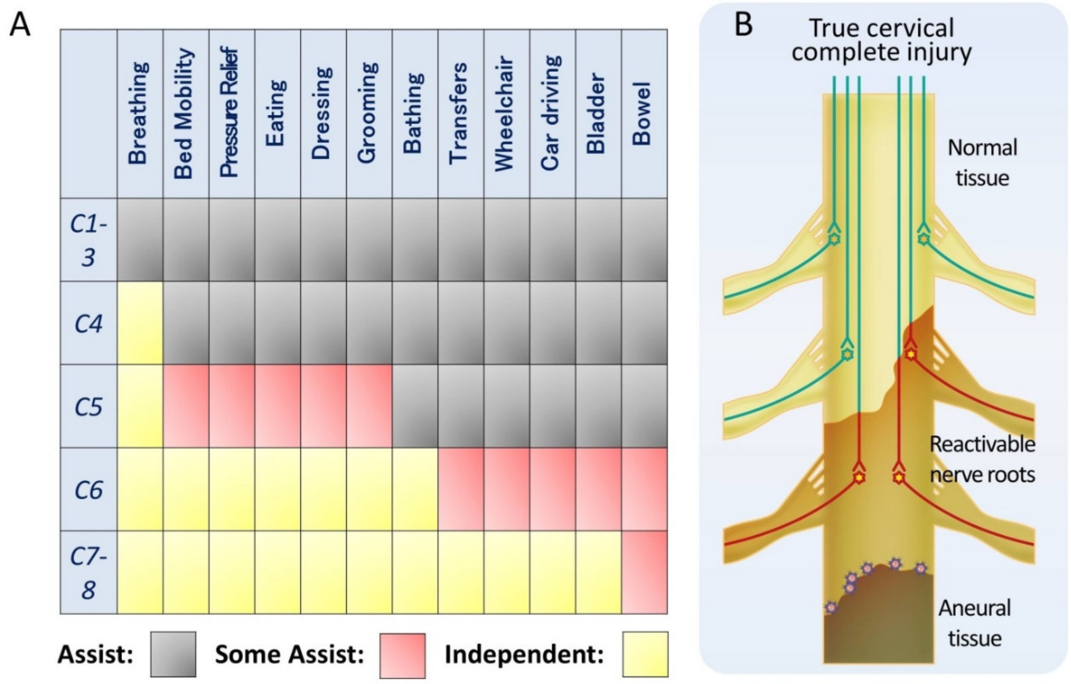 ( B ) 真正的完全性頸髓損傷。神經(jīng)區(qū)穿過脊髓(灰色),但它周圍的可再激活組織(淺棕色)仍然存在。隨著可重新激活的組織因干細胞治療而變得有功能,患者的ADL有望增加。
