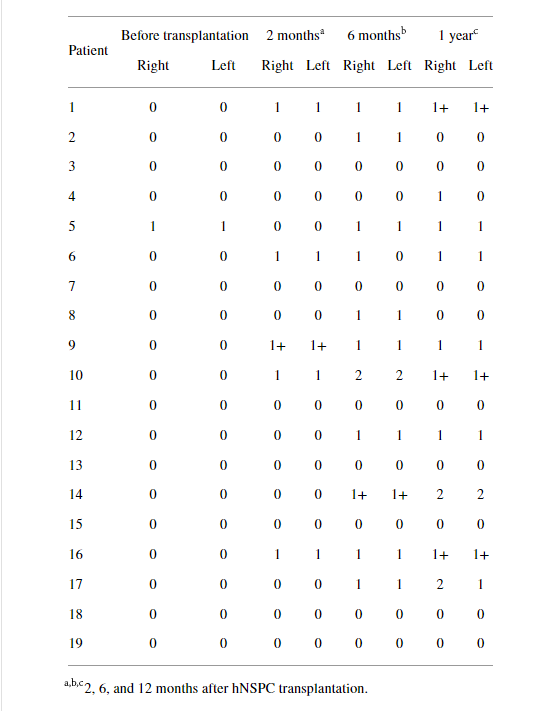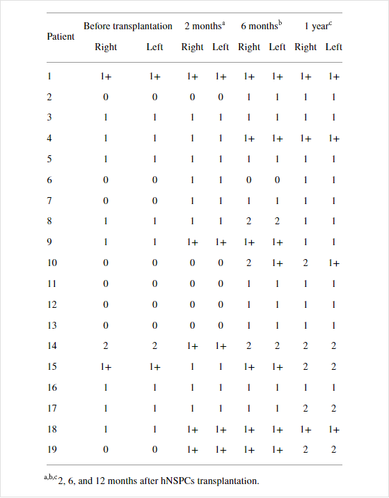 沒有死亡率。在神經(jīng)干/祖細(xì)胞植入后,沒有患者出現(xiàn)感染、腦脊液滲漏、嚴(yán)重危及生命的自主神經(jīng)反射異常或進(jìn)行性脊柱畸形。由于直接將細(xì)胞注射到受傷的脊髓中,術(shù)后感覺和運(yùn)動功能、膀胱并發(fā)癥或神經(jīng)水平?jīng)]有惡化。沒有患者表現(xiàn)出呼吸功能惡化,所有參與者似乎都應(yīng)對得很好。