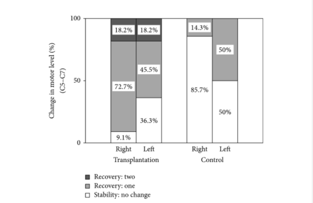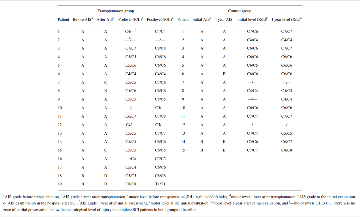因此,與對照組相比,移植組中AIS-A患者在1年時恢復(fù)了一個或多個運(yùn)動水平的比例更高。在基線時,兩組完全SCI患者的神經(jīng)損傷水平以下沒有部分保留區(qū)域。