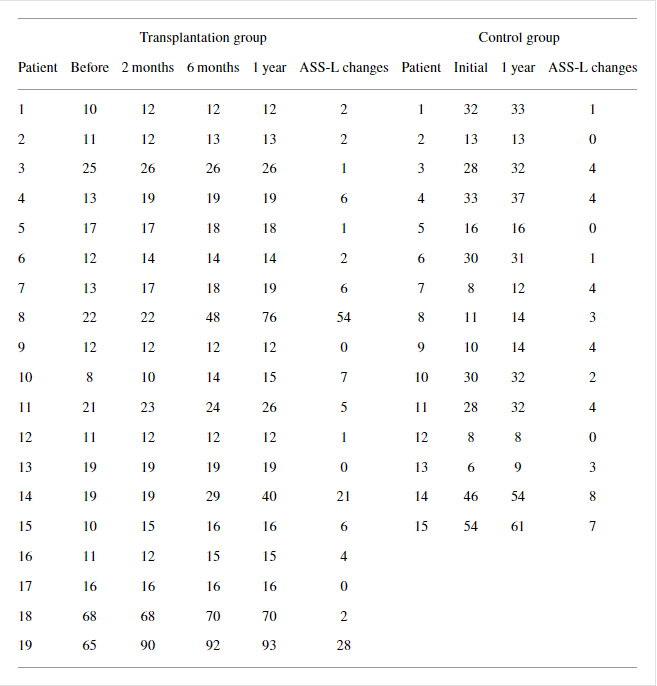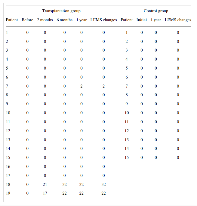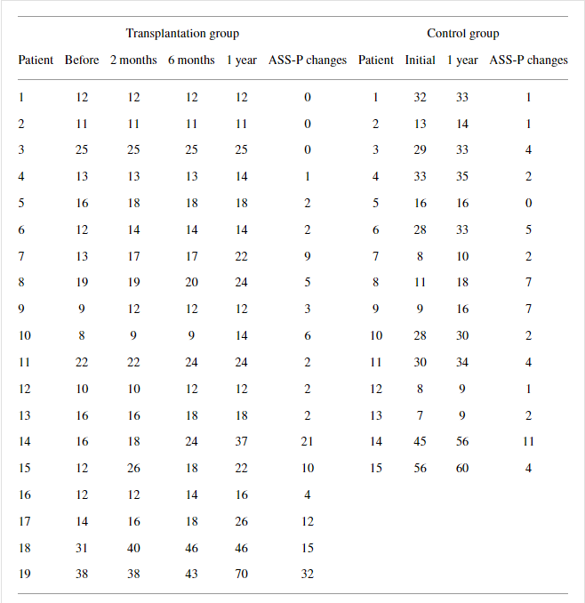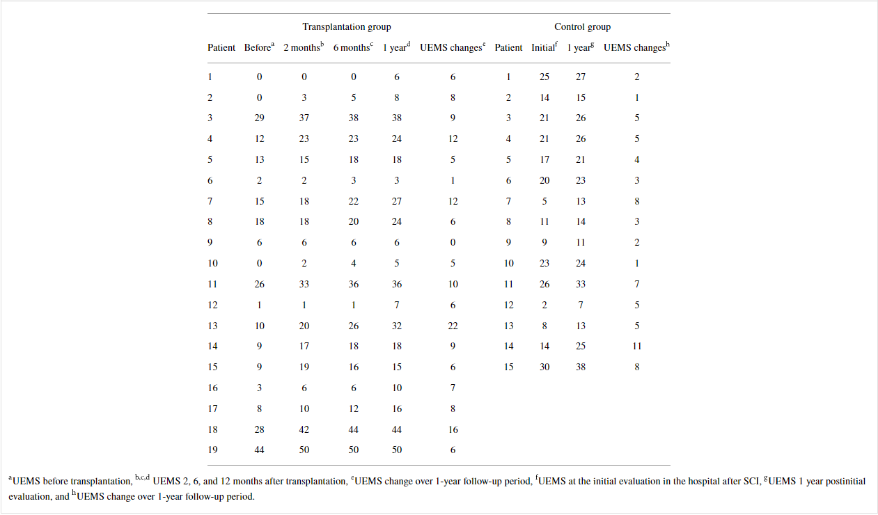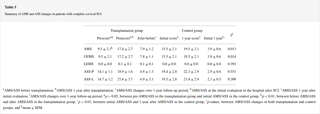 然而,移植組UEMS超過 1 年的平均變化顯著大于對照組(對比; ),而ASS-P和ASS-L超過1年的平均變化在兩組中沒有顯著差異(表5)。在移植組的AIS-A患者中,AIS分級轉(zhuǎn)換與AMS和ASS超過1年的變化之間沒有明顯的相關(guān)性。