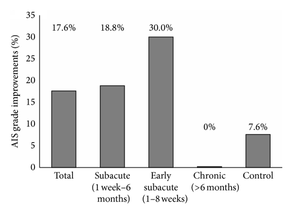 方法:研究人員選擇了 19 名患者進(jìn)行神經(jīng)干/祖細(xì)胞移植。根據(jù)損傷發(fā)作與神經(jīng)干/祖細(xì)胞移植之間的時間窗,符合條件的患者分為四組:急性(<1 周)和、早期亞急性(1-8 周)、晚期亞急性(9 周-6 個月)和慢性(>6 個月)。對照組15例外傷性頸椎SCI患者均行椎管減壓手術(shù)后轉(zhuǎn)診至醫(yī)院康復(fù)門診。他們沒有接受脊髓損傷的神經(jīng)干/祖細(xì)胞植入。