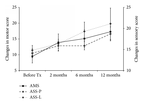 表6-9和圖3總結(jié)了移植組和對照組在基線和1年隨訪期間使用ASIA評分獲得的數(shù)據(jù)變化。在AIS-A患者中,基線時各組之間的任何神經(jīng)學(xué)指標(biāo)(AMS、UEMS、LEMS、ASS-P 或 ASS-L)均無統(tǒng)計學(xué)顯著差異。兩組 AIS-A患者的AMS、UEMS、ASS-P和 ASS-L,但不是LEMS,從基線到1年顯著增加(表5)。這些結(jié)果表明,神經(jīng)系統(tǒng)檢查顯示兩組完全SCI患者的運(yùn)動和感覺評分隨時間輕微但顯著增加。