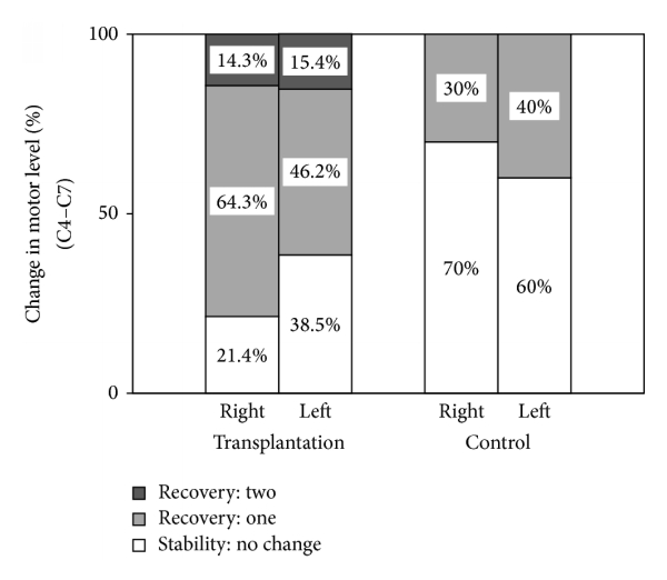 在移植組和對照組中初始運(yùn)動水平為C4至C7的AIS-A SCI受試者中,沒有患者在1年內(nèi)因一個或多個運(yùn)動水平而惡化(表4)。在基線評估后1年,兩組中初始C4–C7或C5–C7 SCI 的個體在右側(cè)和左側(cè)具有穩(wěn)定或正在恢復(fù)的運(yùn)動水平的比例如圖4所示。對于移植組初始C5–C7 SCI的受試者,運(yùn)動水平保持不變,分別為 9.1% 和 36.3%(右側(cè)和左側(cè),分別為72.7%和45.5%,提高了一個水平,18.2%提高了兩個水平% 和 18.2%。AIS 等級轉(zhuǎn)換似乎不會影響電機(jī)水平變化。然而,在對照組中,運(yùn)動水平在 85.7% 和 50.0%(分別為右側(cè)和左側(cè))中保持不變,在14.3%和50.0%中提高了一個水平,沒有患者恢復(fù)兩個水平(圖4(b) ))。在1年時兩組中具有穩(wěn)定或恢復(fù)運(yùn)動水平的初始C4-C7運(yùn)動水平SCI個體的比例與具有初始C5-C7運(yùn)動水平的患者相似(圖4(a))。