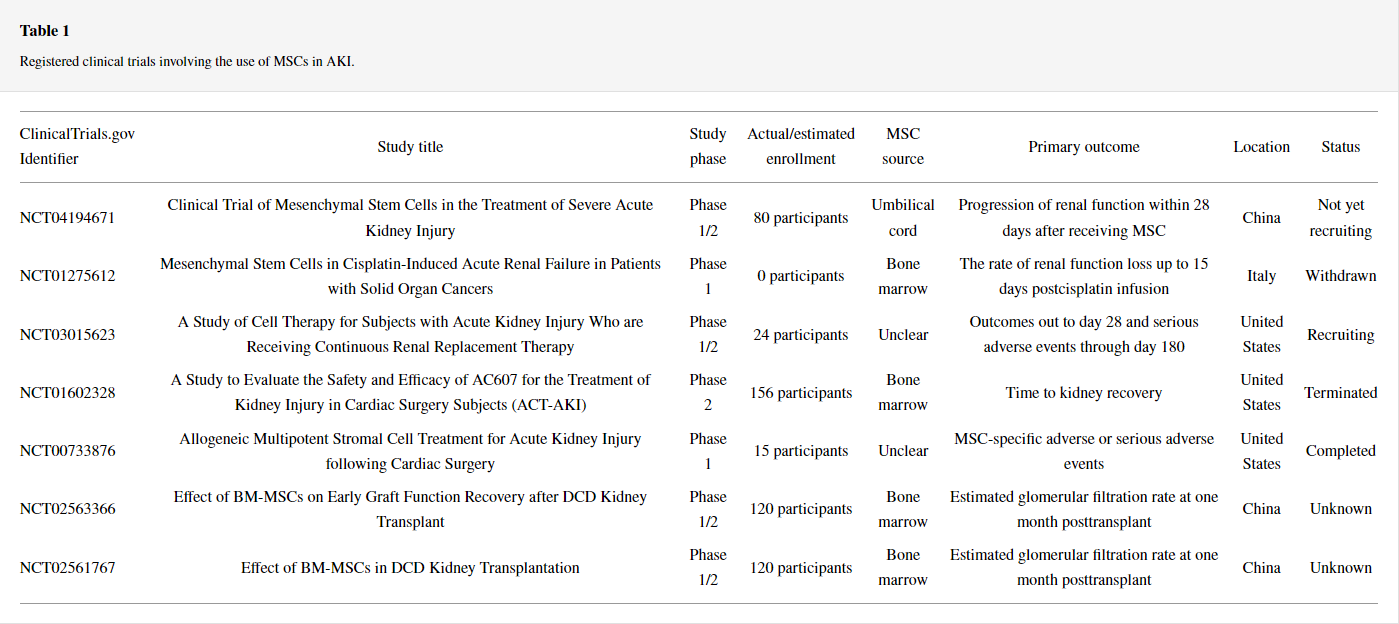 目前,迫切需要對(duì)不同類(lèi)型的AKI患者進(jìn)行額外的大型臨床試驗(yàn),以闡明MSC治療在AKI背景下的作用。已經(jīng)進(jìn)行了幾項(xiàng)正在進(jìn)行的試驗(yàn)來(lái)解決這些問(wèn)題,表1列出了ClinicalTrials.gov上關(guān)于AKI患者的MSC治療的所有注冊(cè)試驗(yàn)。