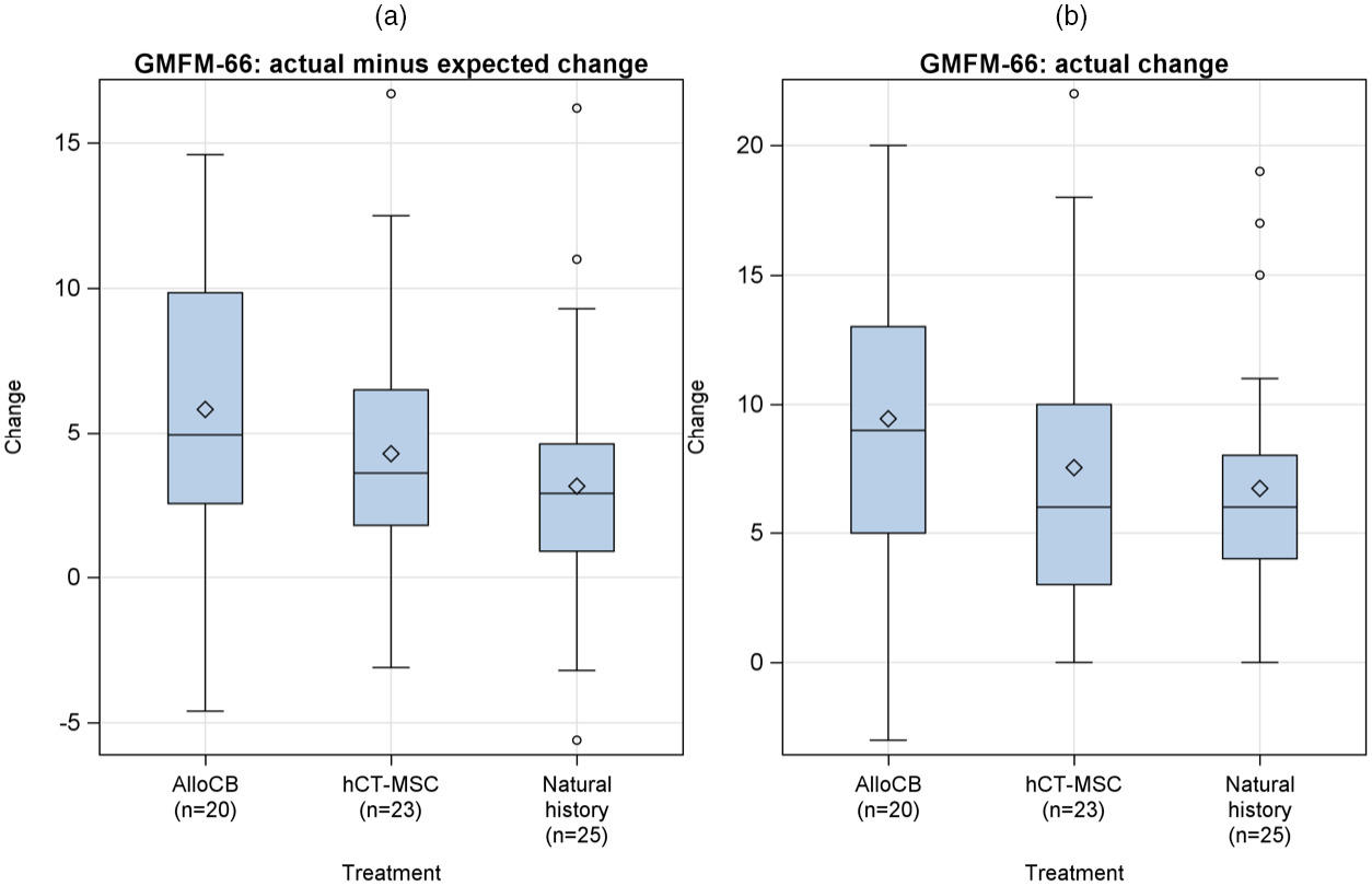 (a) 研究的主要結果是GMFM-66從基線到第12個月的實際減去預期變化。平均變化(和95%置信區(qū)間)為 5.8 (3.4–8.2)、4.3 (2.2–6.4 ),同種異體臍帶血 (AlloCB)、人臍帶組織來源的間充質基質細胞 (hCT-MSC) 和自然歷史臂分別為 3.1 (1.4–5.0)。