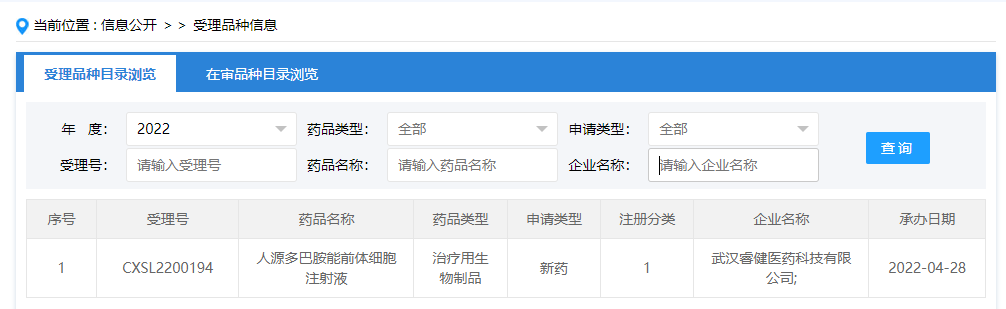 2022年4月28日,據(jù)國(guó)家藥監(jiān)局藥品審查中心(CDE)官網(wǎng)-受理品種信息公示,武漢睿健醫(yī)藥科技有限公司(簡(jiǎn)稱“睿健醫(yī)藥”)“人源多巴胺能前體細(xì)胞注射液”(代號(hào):NouvNeu001)臨床試驗(yàn)申請(qǐng)(IND)已獲受理(受理號(hào):CXSL2200194)。