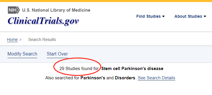 截止2023年2月,在美國(guó)國(guó)立衛(wèi)生研究院的最大臨床試驗(yàn)注冊(cè)庫clinicaltrials.gov網(wǎng)站上注冊(cè)的有關(guān)干細(xì)胞移植治療帕金森病的臨床研究項(xiàng)目有29項(xiàng),其中中國(guó)有7項(xiàng)。所涉及干細(xì)胞類型有神經(jīng)干細(xì)胞、骨髓干細(xì)胞、臍帶間充質(zhì)干細(xì)胞等,其中有些項(xiàng)目已經(jīng)完成,有些正在招募。