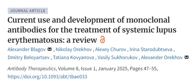 [2]Alexander Blagov, Nikolay Orekhov, Alexey Churov, Irina Starodubtseva, Dmitry Beloyartsev, Tatiana Kovyanova, Vasily Sukhorukov, Alexander Orekhov, Current use and development of monoclonal antibodies for the treatment of systemic lupus erythematosus: a review, Antibody Therapeutics, Volume 8, Issue 1, January 2025, Pages 47–55, https://doi.org/10.1093/abt/tbae033