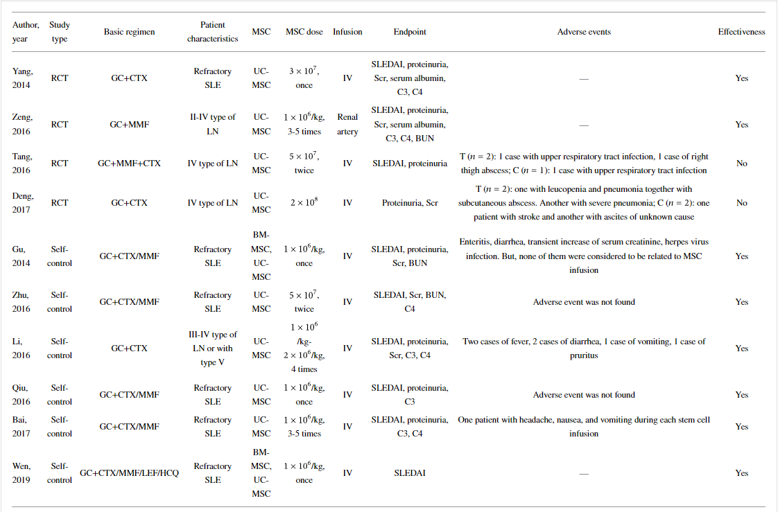 結(jié)果:在RCT中,結(jié)果表明MSC組在3個(gè)月和6個(gè)月時(shí)的蛋白尿低于對(duì)照組,MSC組在2個(gè)月和6個(gè)月時(shí)顯示出低于對(duì)照組的 SLEDAI。此外,, 95% CI: 0.07, 0.89,). 在病例系列試驗(yàn)中,結(jié)果表明MSC組在1個(gè)月、2個(gè)月、3個(gè)月、4個(gè)月、6個(gè)月和12個(gè)月時(shí)蛋白尿較低。總之,間充質(zhì)干細(xì)胞可能是SLE患者有前途的治療藥物。