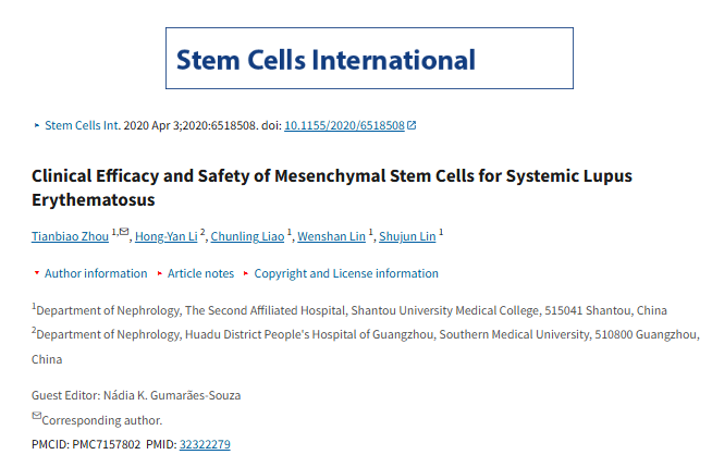 2020年4月3日,汕頭大學(xué)醫(yī)學(xué)院在國(guó)際期刊《Stem Cell International》上發(fā)布了一篇《間充質(zhì)干細(xì)胞治療系統(tǒng)性紅斑狼瘡的臨床療效及安全性》的研究結(jié)果。