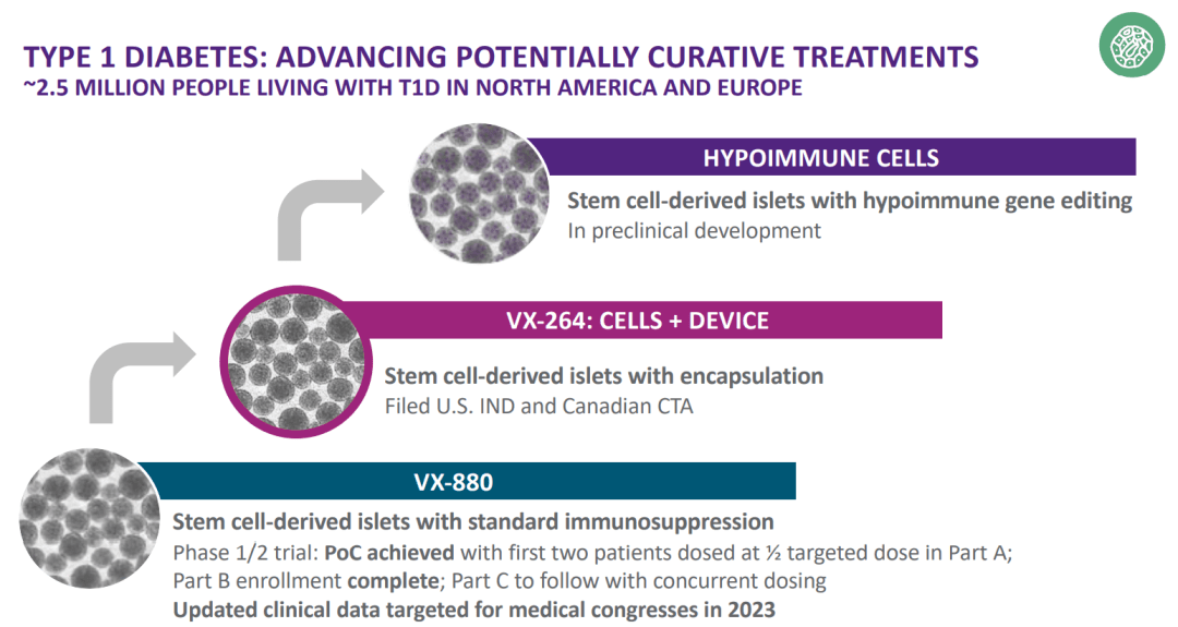 Vertex正在采用多種研究方法,使用干細(xì)胞衍生的胰島,以取代T1D患者體內(nèi)破壞的產(chǎn)生胰島素的胰島細(xì)胞。Vertex在T1D的第一個(gè)臨床研究項(xiàng)目VX-880是一種干細(xì)胞衍生的、完全分化的、產(chǎn)生胰島素的胰島細(xì)胞替代療法,與免疫抑制結(jié)合使用。Vertex已在VX-880項(xiàng)目中證明了概念的臨床證明,美國(guó)和加拿大正在進(jìn)行1/2期臨床研究。